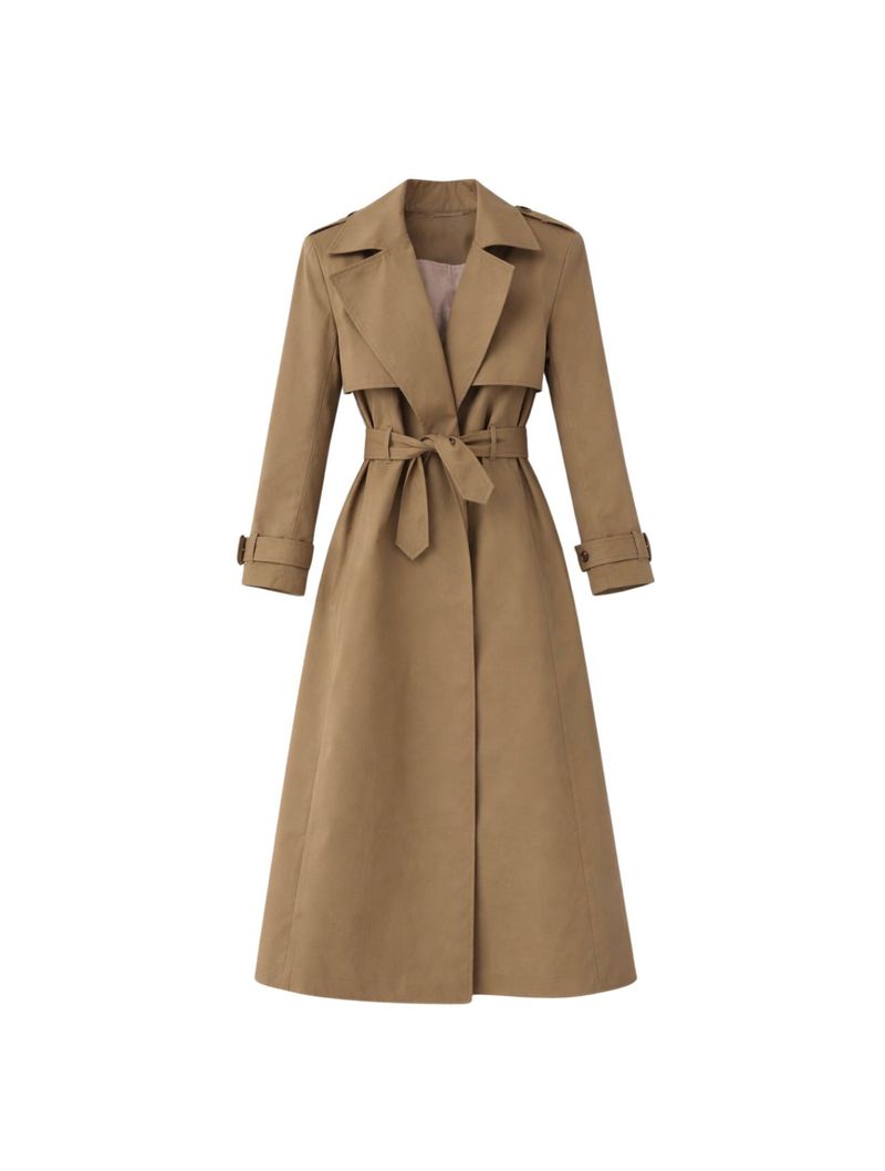 O modelo não possui fechamento por botões ou zíper, permitindo diferentes formas de uso. Acompanha faixa do mesmo tecido para amarração na cintura, possibilitando ajustar o caimento e marcar a silhueta de forma elegante.