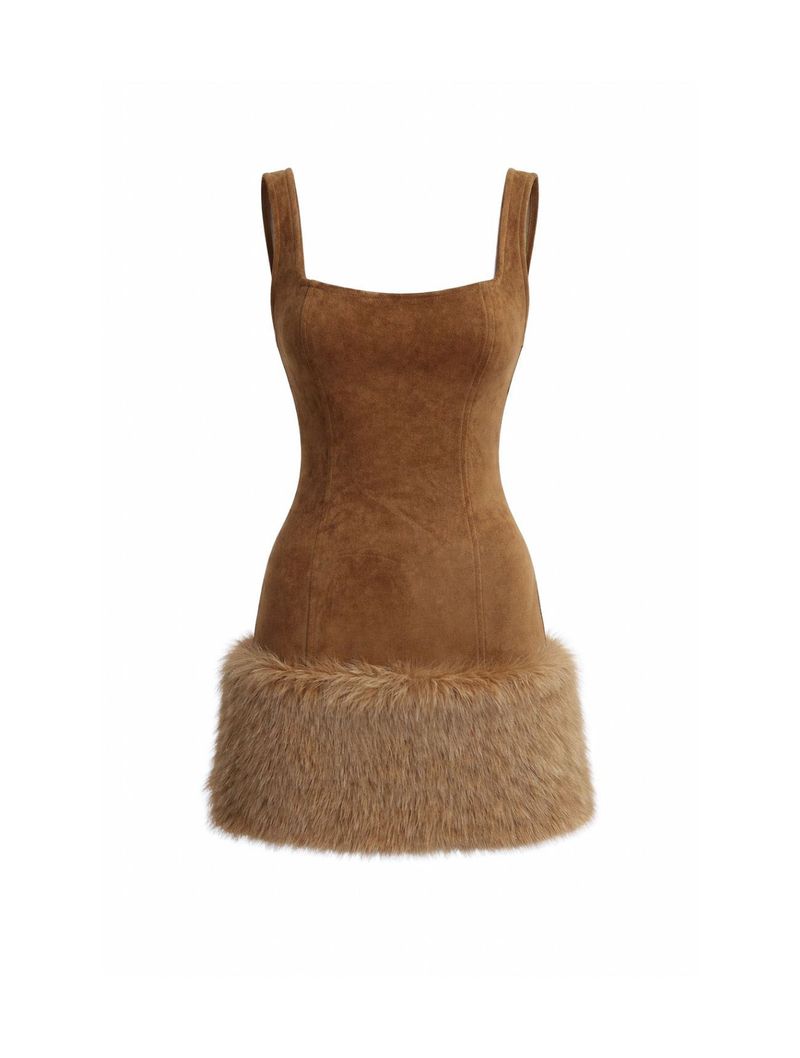 Confeccionado em suede com elastano, o vestido possui modelagem justa ao corpo, valorizando a silhueta, decote reto e alças médias.
