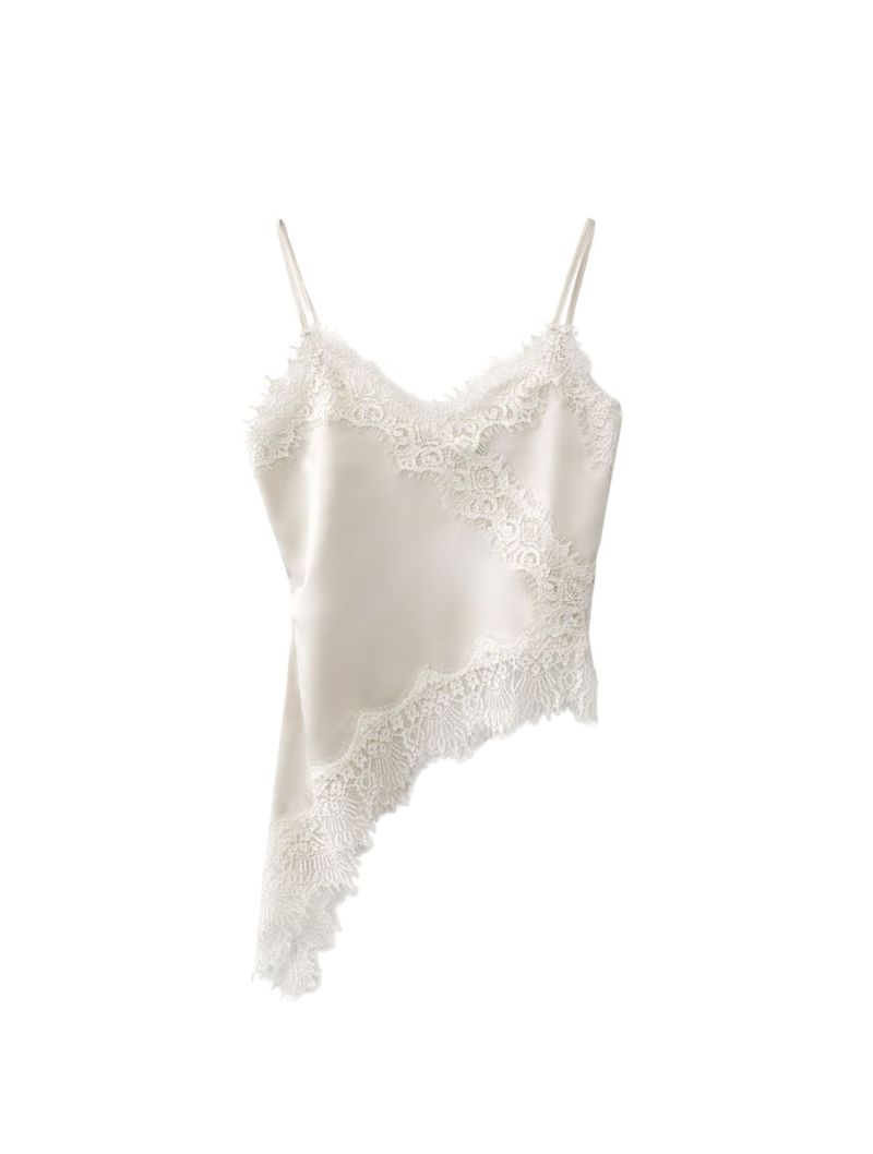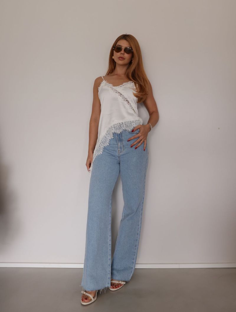 O modelo conta apresenta alcinhas finas e decote em V, valorizando o colo com delicadeza. Os detalhes em renda aplicada no barrado e no decote reforçam o caráter feminino da peça e trazem um contraste elegante, seguindo uma das tendências mais fortes da temporada.