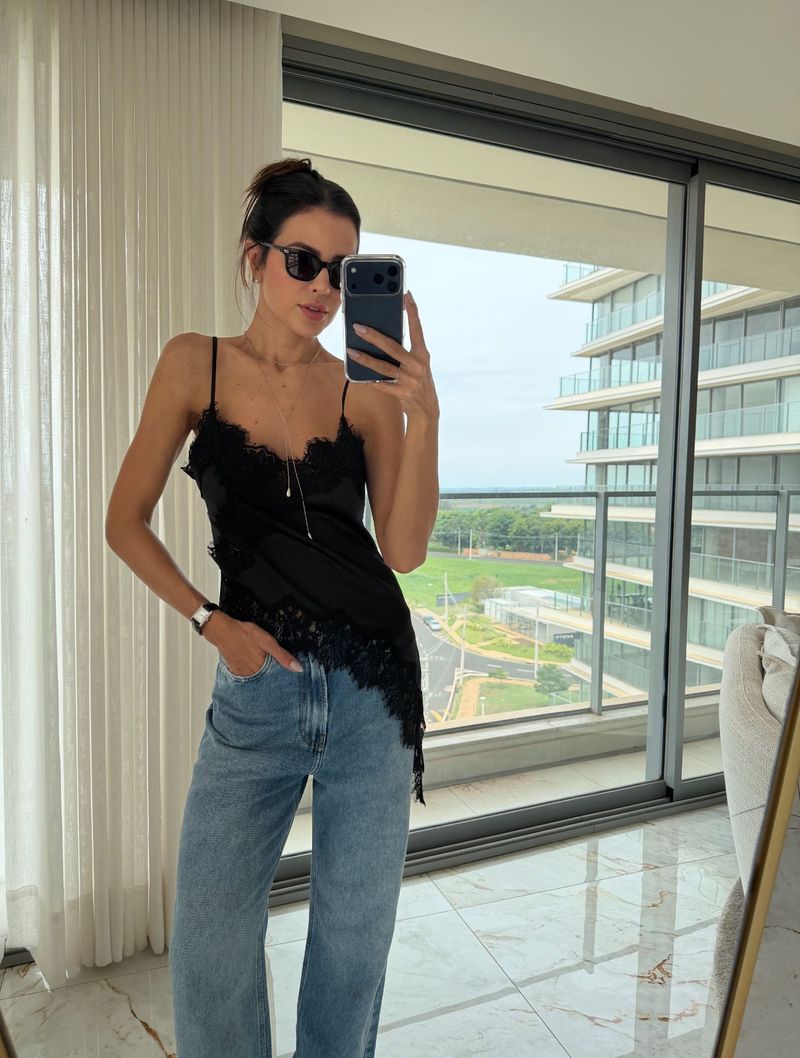 O modelo conta apresenta alcinhas finas e decote em V, valorizando o colo com delicadeza. Os detalhes em renda aplicada no barrado e no decote reforçam o caráter feminino da peça e trazem um contraste elegante, seguindo uma das tendências mais fortes da temporada.