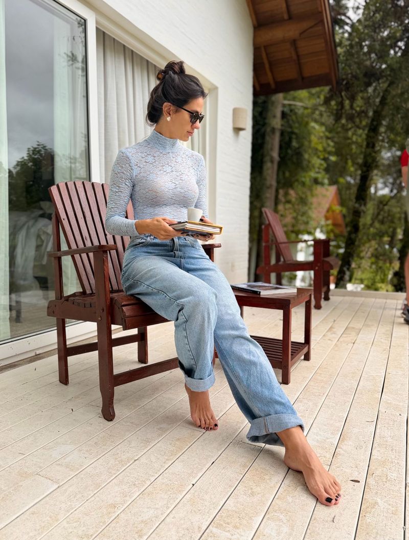 Confeccionado em renda com leve elastano, o modelo possui manga longa, golinha alta e modelagem justinha ao corpo. A renda traz uma leve transparência, característica da peça, que adiciona charme e sensualidade na medida certa.