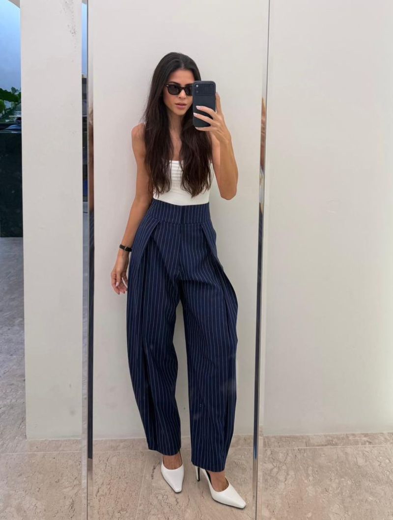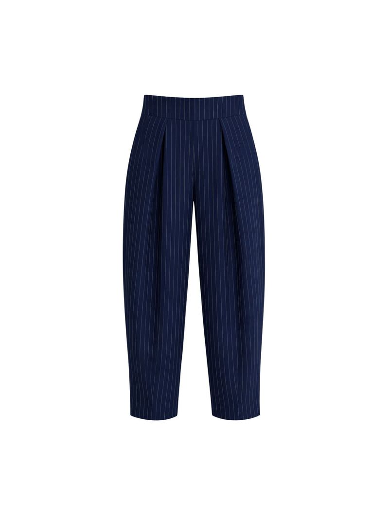 Confeccionada em crepe de alfaiataria com estampa risca de giz, possui cintura alta e cós largo, valorizando a silhueta com estrutura. A modelagem balloon traz volume na medida certa, criando um caimento moderno e diferenciado.