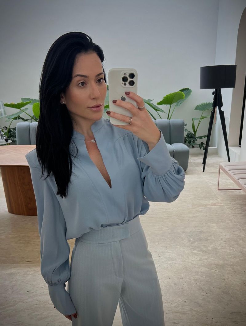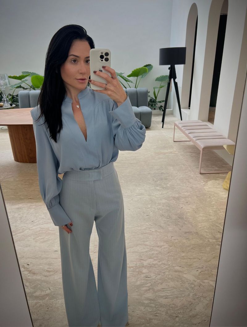 Apresenta mangas longas levemente bufantes, decote em 'V' com detalhe em patô e ombreiras.