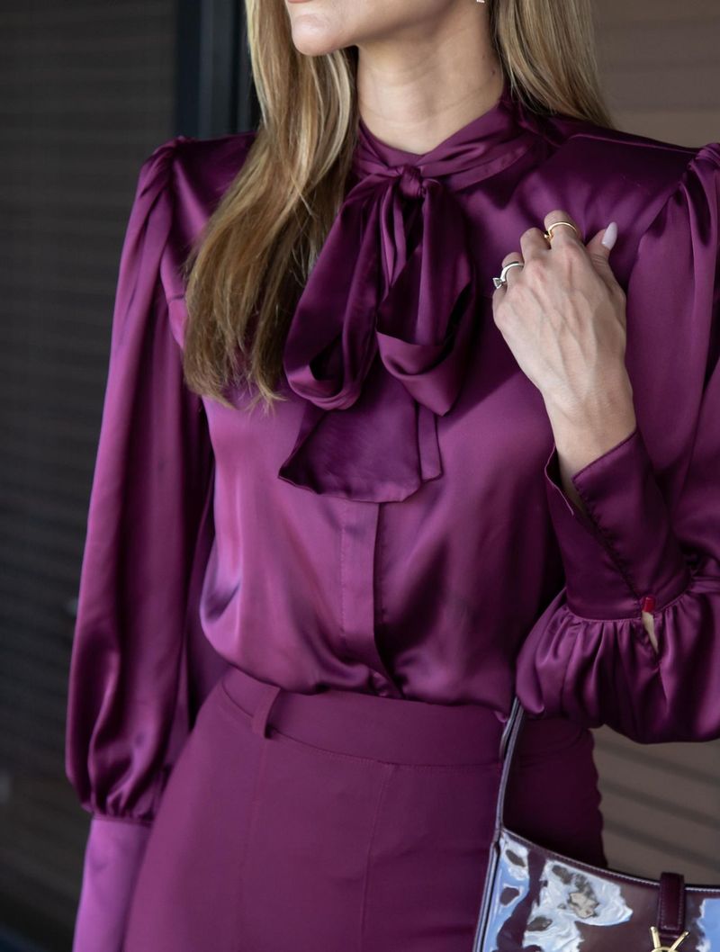 As ombreiras estruturam o visual, enquanto as mangas levemente bufantes com punho aplicado e botão de madrepérola adicionam feminilidade e elegância.