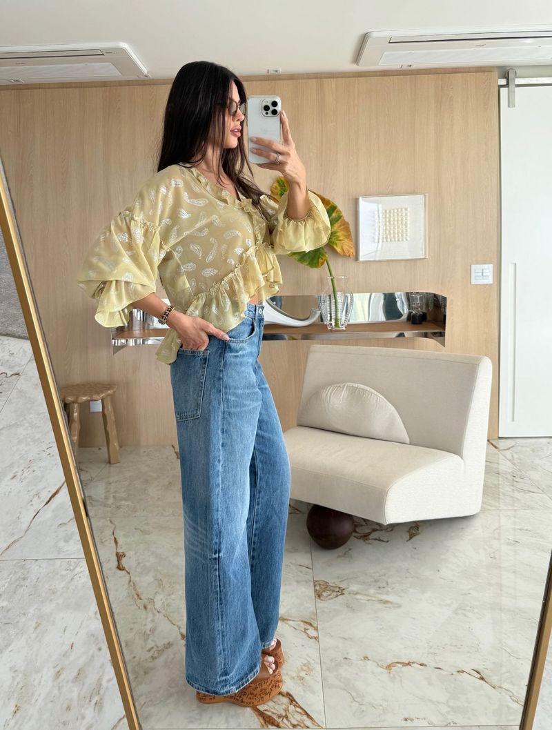 A Camisa Luciana é confeccionado em crepe com leve transparência e possui modelagem cropped.