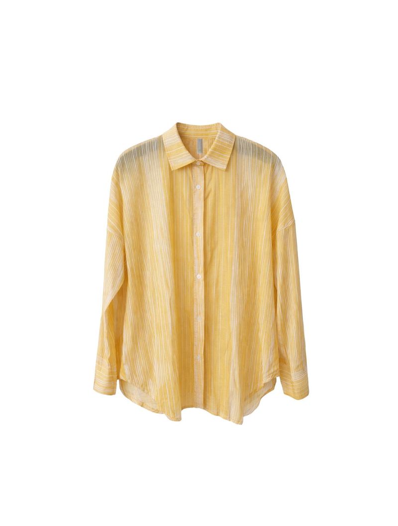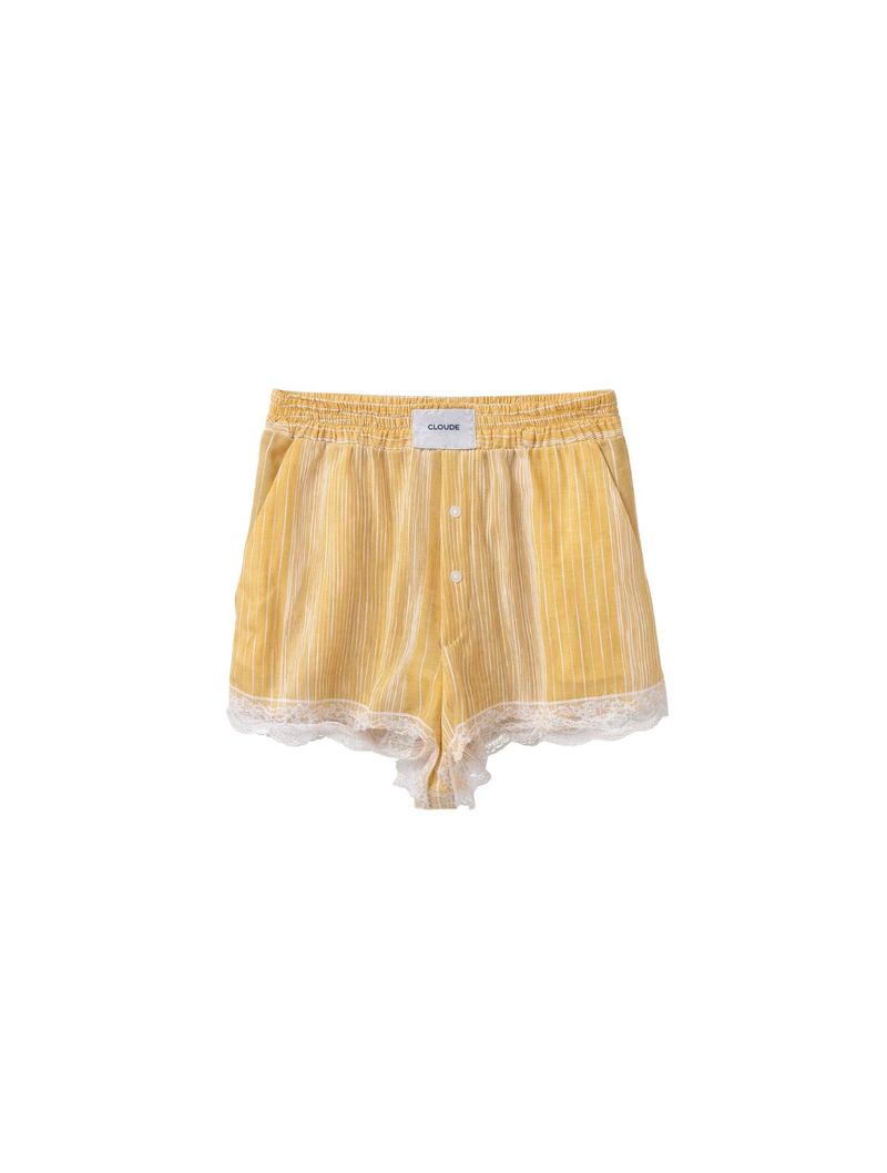 A camisa possui modelagem reta, mangas longas, golinha clássica e martingale nas mangas, permitindo diferentes formas de uso no punho. O short conta com cós com elástico aplicado, que se ajusta confortavelmente ao corpo, além de etiqueta CLOUDE bordada na parte frontal e detalhe em guipir no barrado, que traz um acabamento delicado e especial à peça.