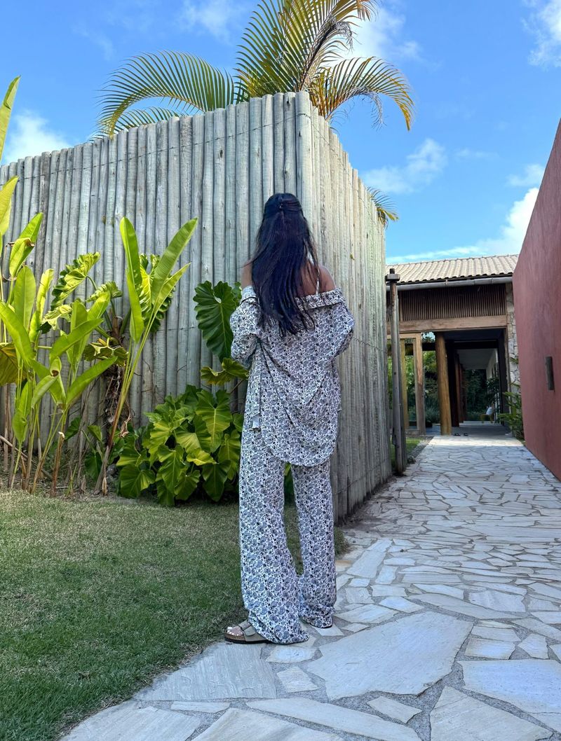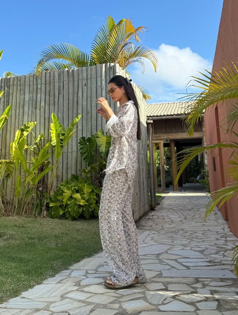 O conjunto Gloria é confeccionado em tecido leve e fluido e composto por calça e camisa.