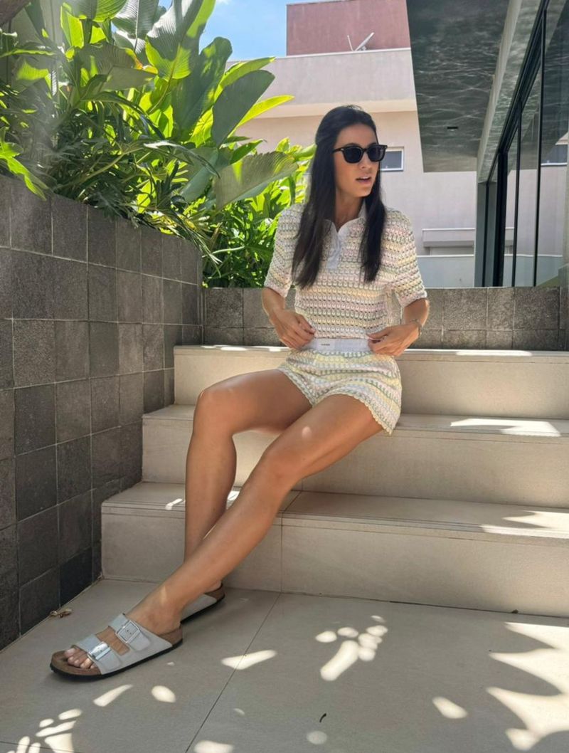 O conjunto Paula é confeccionado em tricot e composto por short e camiseta.