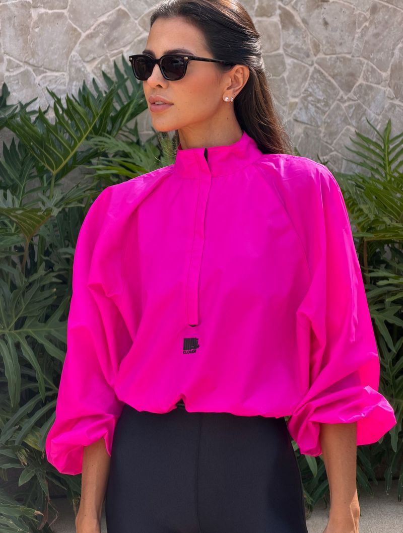 Apresenta modelagem soltinha ao corpo, gola alta e detalhe em zíper tratirado frontal.