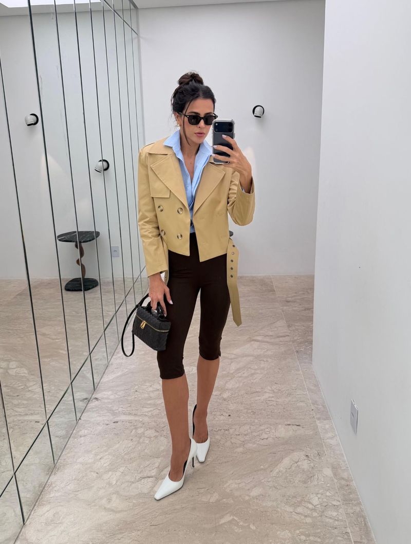 Fechamento frontal por botões e cinto para amarração, que permite ajustar a peça ao corpo, valorizando a cintura e criando diferentes propostas de uso, mais alinhadas ou mais despojadas.