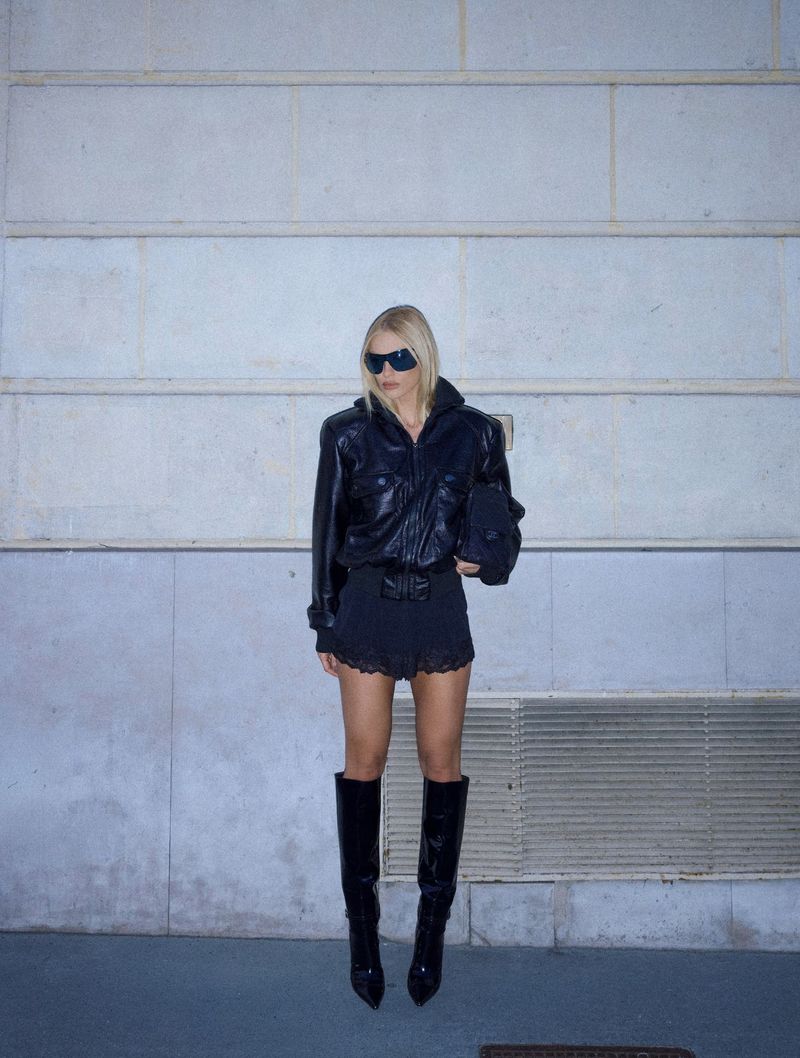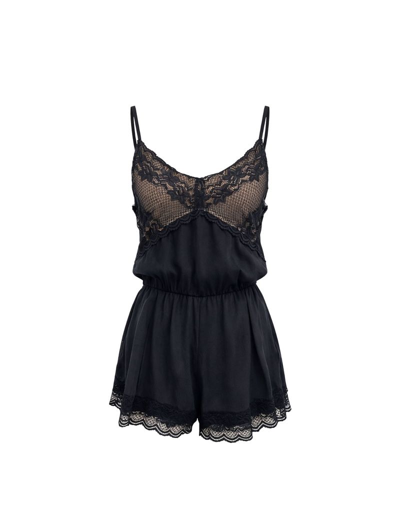 O busto em renda com forro nude cria um contraste sofisticado com o preto, destacando os detalhes e trazendo um efeito lindo. No barrado do short, o acabamento em renda reforça a delicadeza da peça e adiciona ainda mais charme.