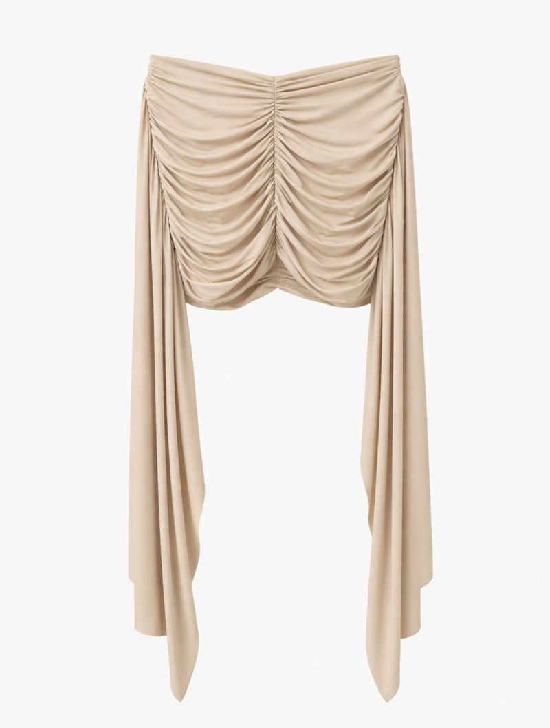 Na cor champanhe, a saia possui modelagem justa ao corpo, com drapeado por toda a peça, criando um caimento bonito e elegante. As faixas soltas na lateral adicionam fluidez e um detalhe fashion que faz toda a diferença no look.