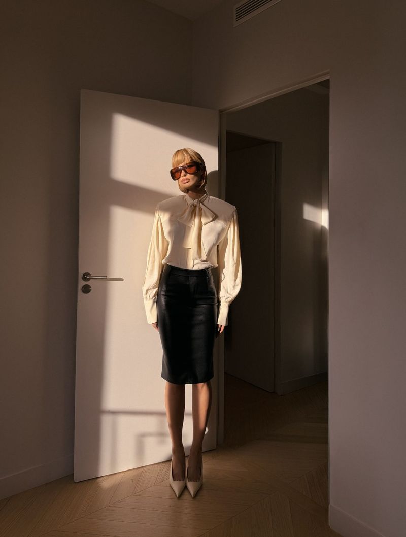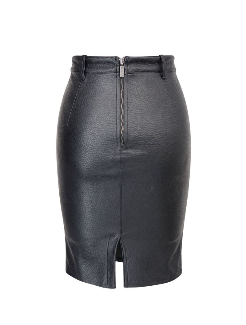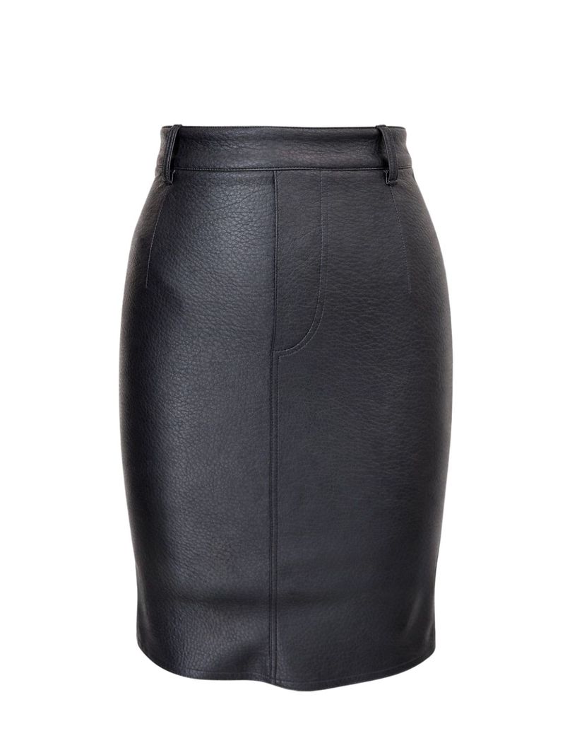 Confeccionada em couro sintético, a saia possui comprimento midi e modelagem lápis, ajustada ao corpo, marcando a cintura e o quadril de forma elegante. A cintura alta alonga a silhueta, enquanto a fenda posterior garante mobilidade e um detalhe discreto de sensualidade.