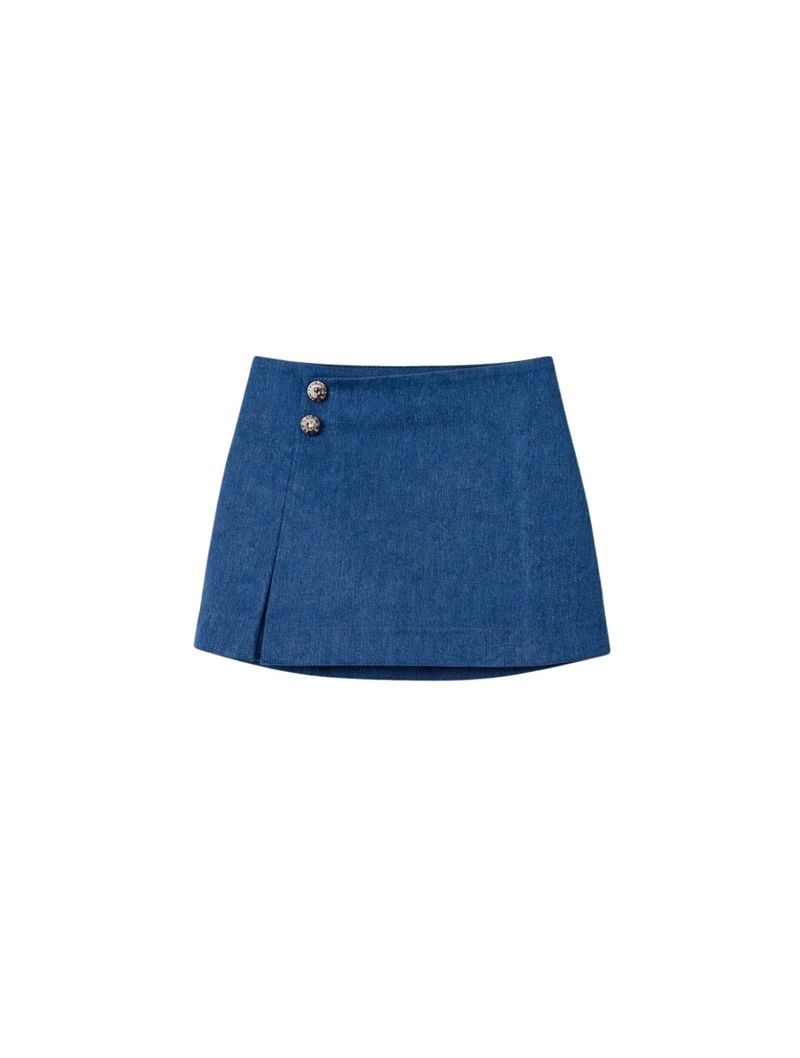 Confeccionado em jeans, possui cintura alta e modelagem envelope, que traz um visual mais interessante e moderno. O destaque fica por conta do recorte assimétrico frontal e das aplicações de botões em resina, que adicionam personalidade à peça.