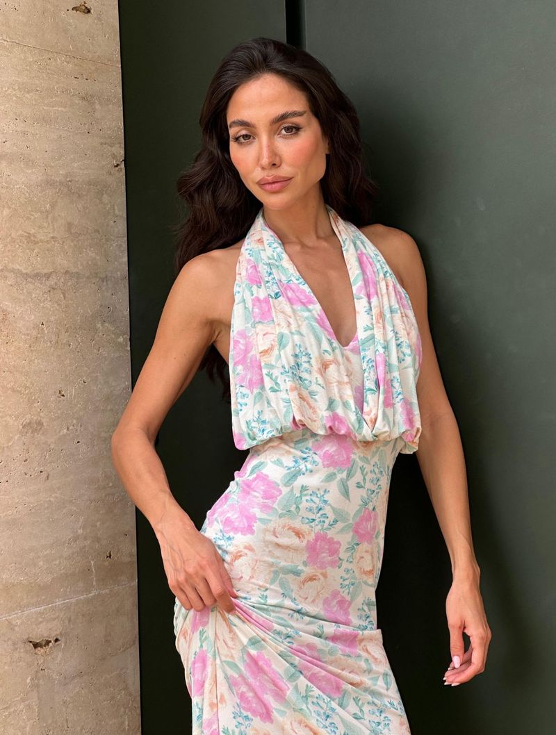 O vestido apresenta decote em V, decote nas costas e fechamento na nuca por botões, detalhes que equilibram delicadeza e sensualidade. O comprimento longo até o chão completa a proposta com fluidez, tornando a peça ideal para ocasiões especiais à luz do dia.