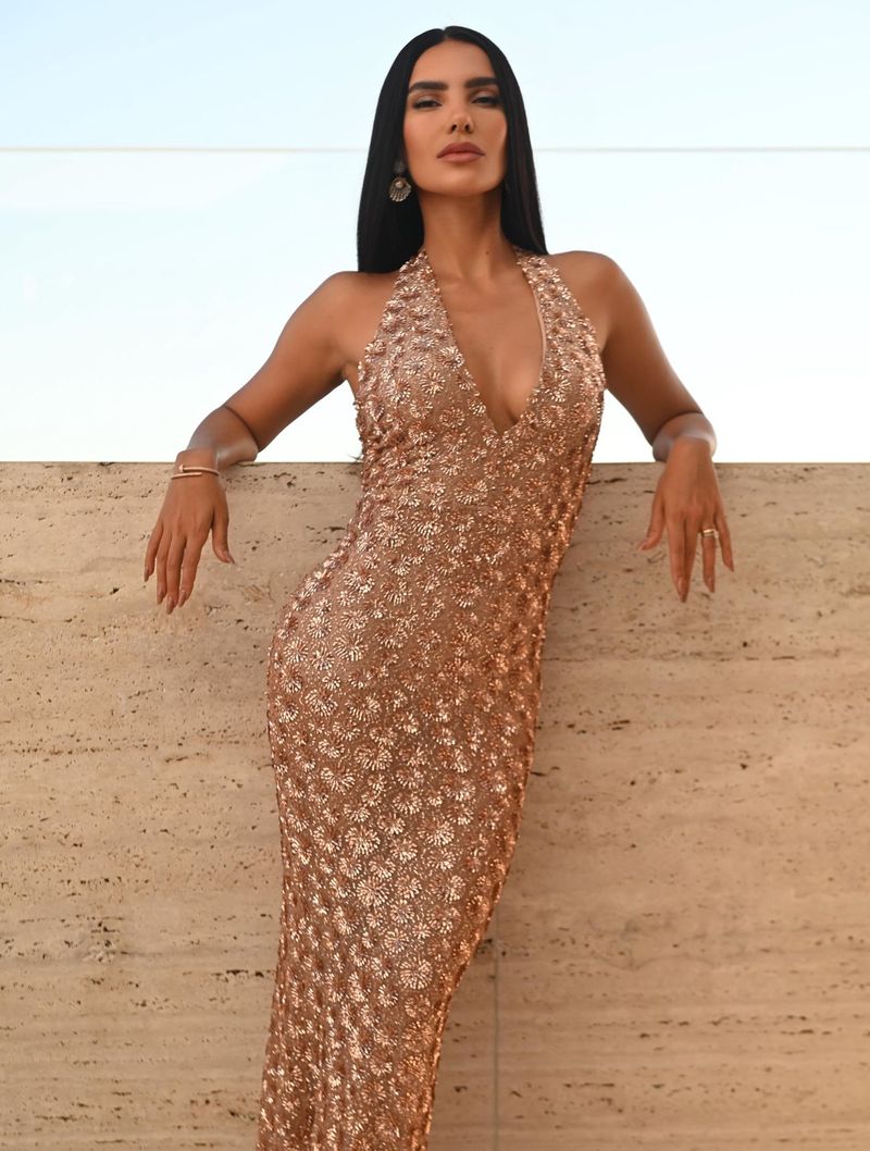 O vestido Flora é confeccionado em paetê e possui comprimento longo.