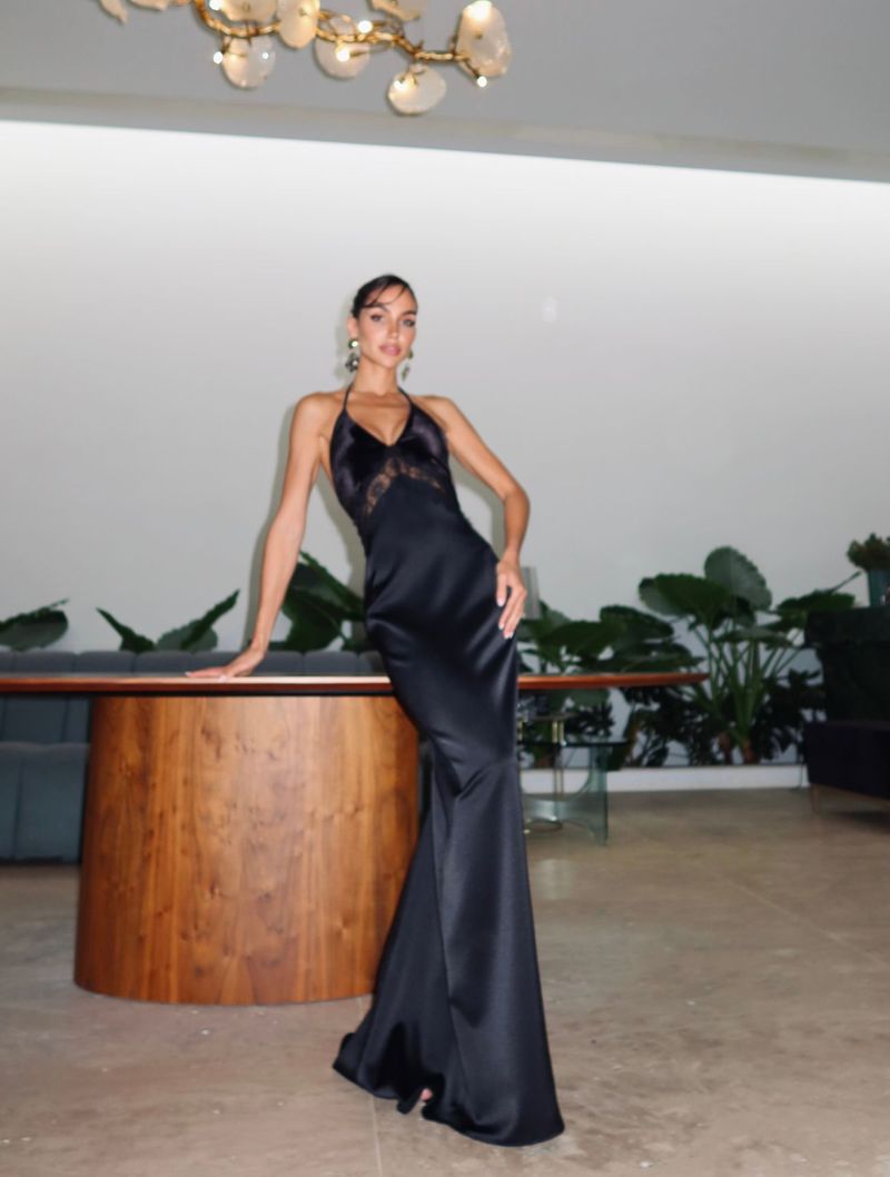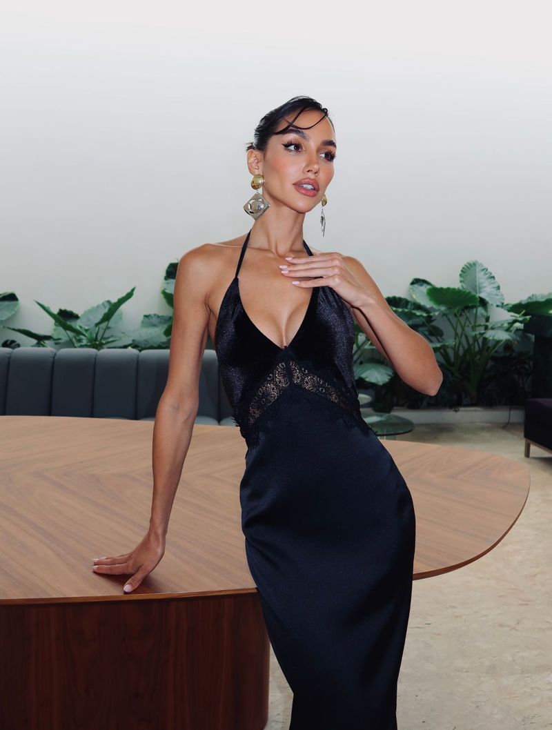 O modelo apresenta decote frente única, com amarração na nuca, além de um corpinho em veludo com aplicações de renda, que adiciona textura, profundidade e um contraste sofisticado à peça.