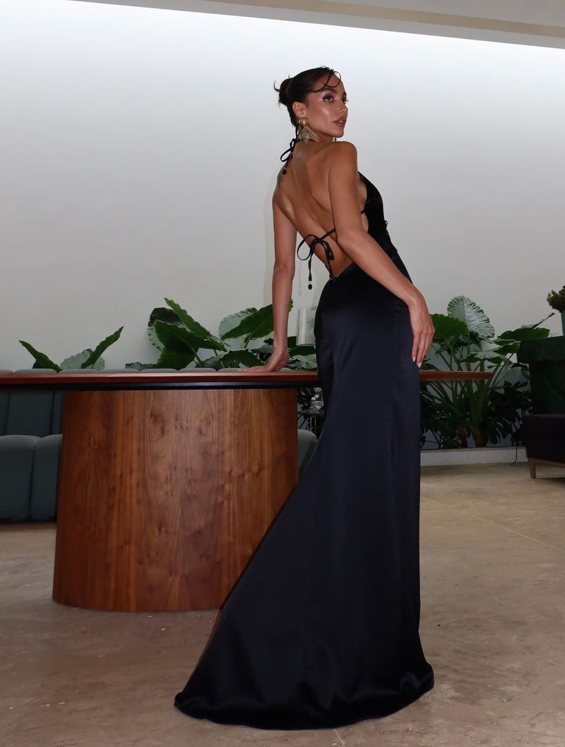O decote nas costas, combinado com amarração posterior, cria um visual impactante e extremamente feminino. O fechamento é posterior por zíper, garantindo segurança e acabamento impecável.