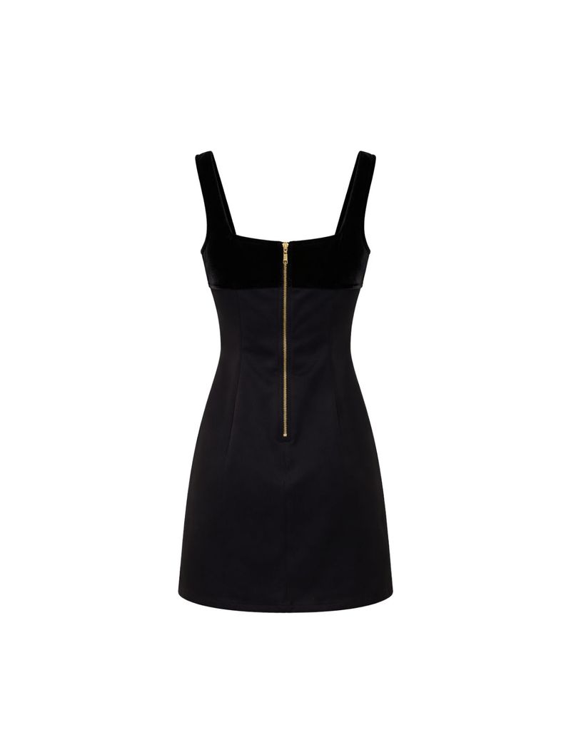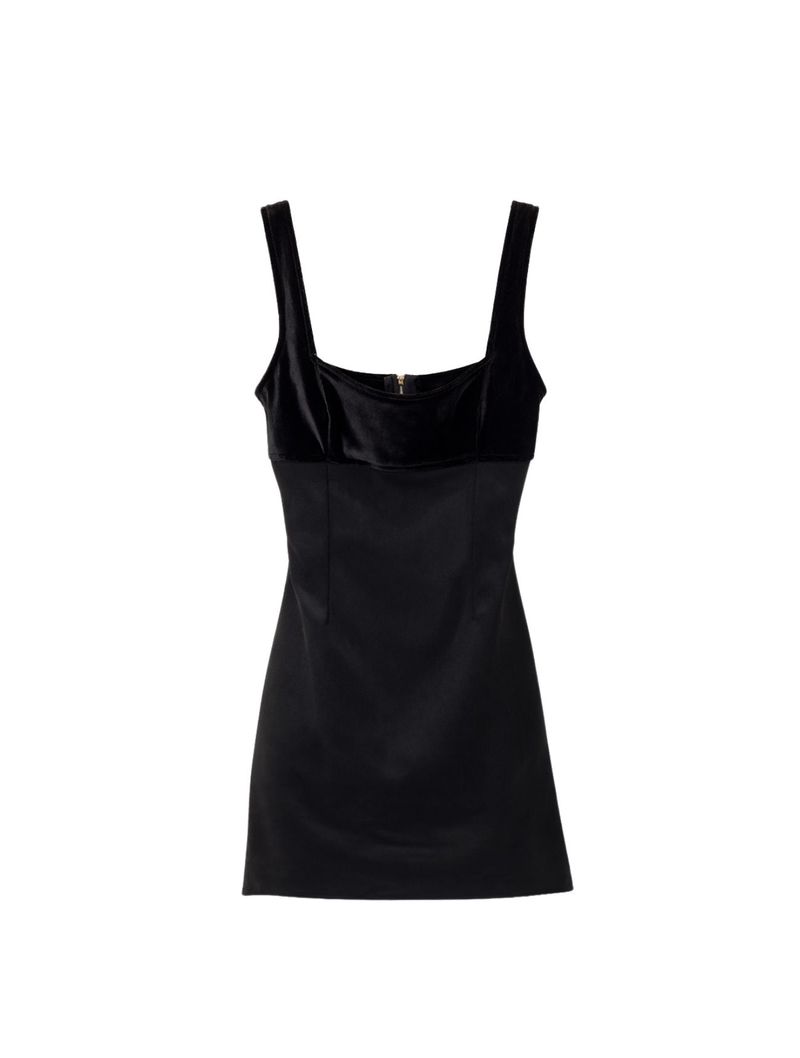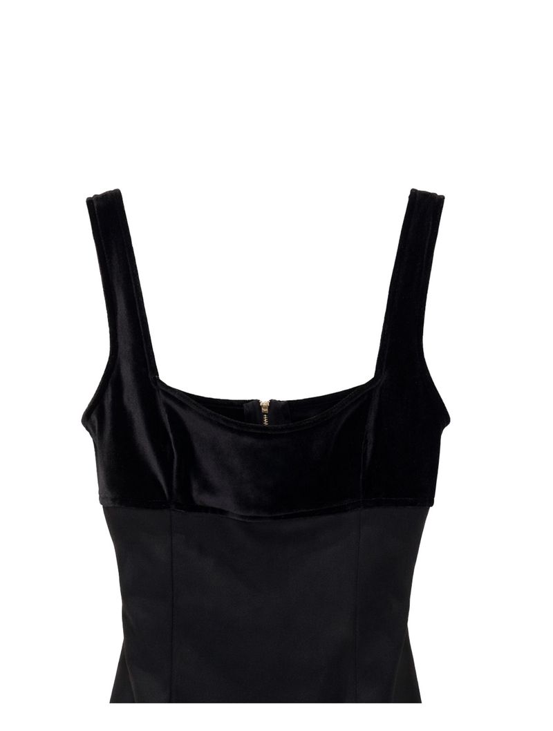 O decote quadrado valoriza o colo, enquanto o detalhe em veludo no decote e nas alças traz contraste de textura e um acabamento sofisticado à peça.