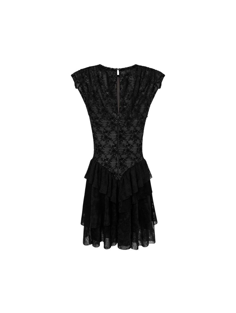 Confeccionado em renda, o vestido possui modelagem justinha ao corpo na parte superior, desenhando a silhueta de forma elegante. A saia evasê com babados adiciona movimento e leveza ao visual, equilibrando o look com um toque romântico.