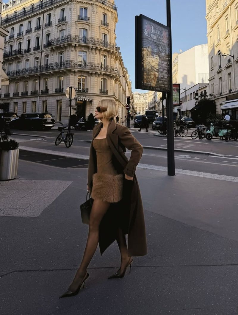 O grande destaque fica por conta do detalhe em pelo no barrado, formando uma pala em pelo caramelo, que traz textura, movimento e um toque sofisticado à peça.
