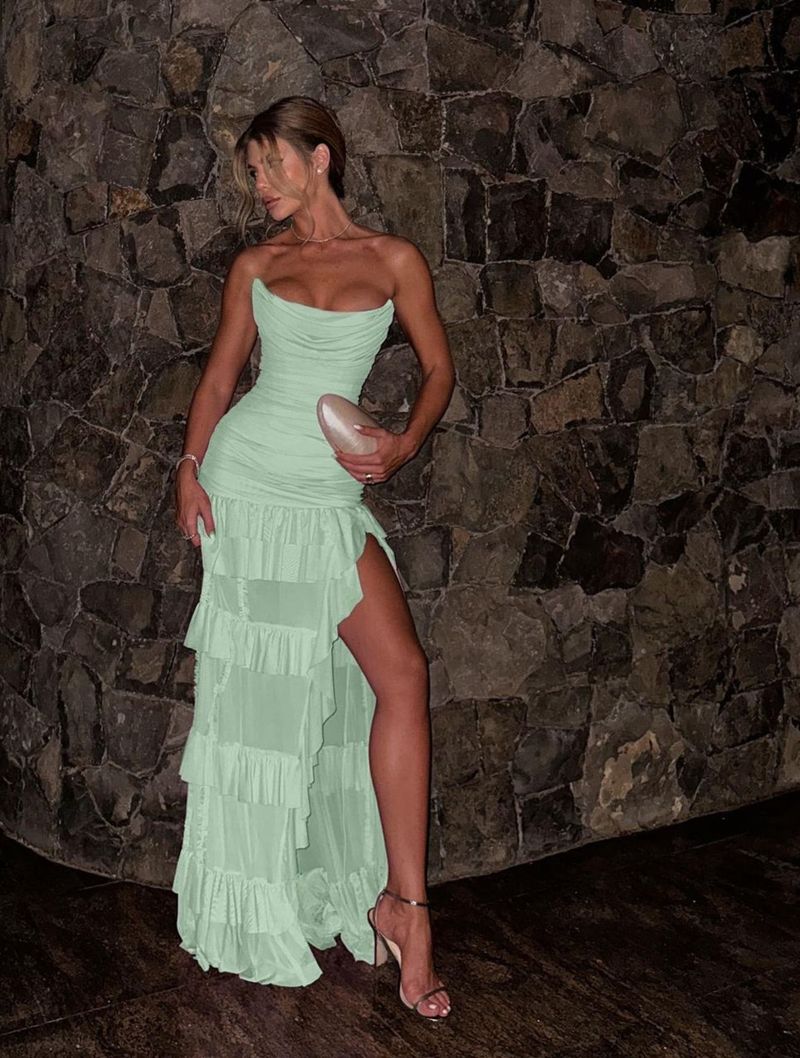 Fica lindo com salto alto de tirinhas finas e é perfeito para ocasiões especiais.