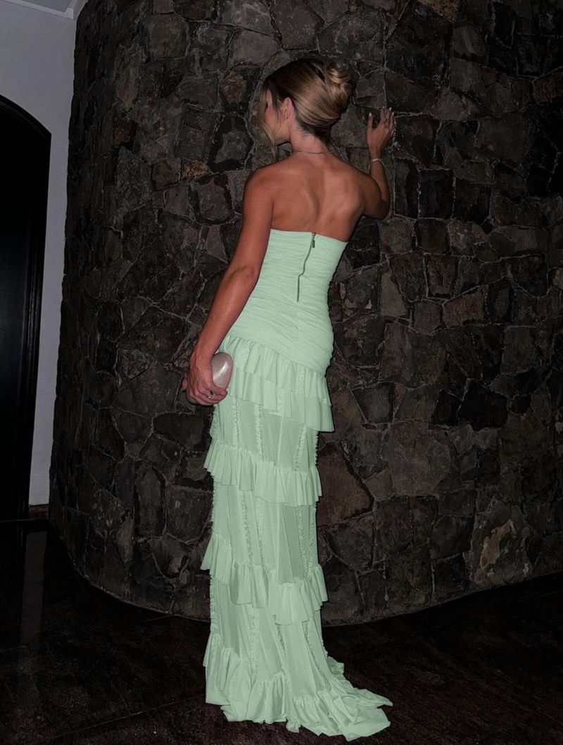 O vestido Luane é confeccionado em tule e possui comprimento longo.